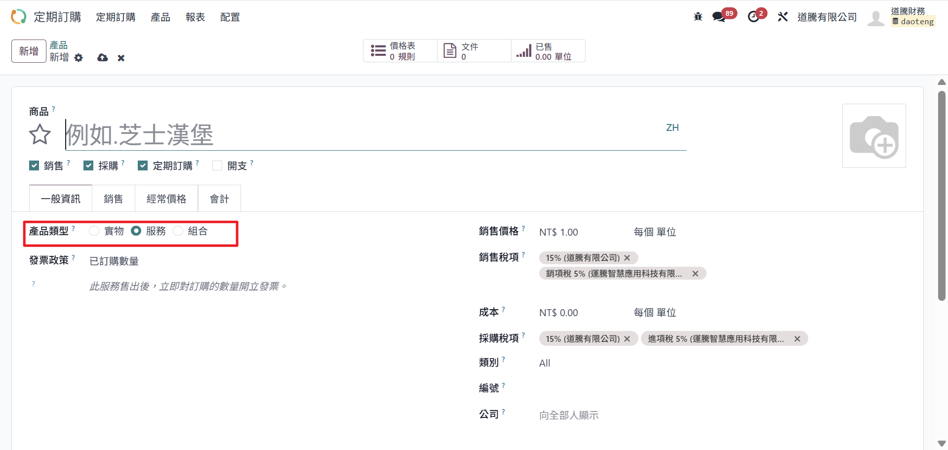 - 透過勾選不同屬性,可決定此商品可用於哪些業務流程。銷售:勾選後,商品可被加入報價單與銷售訂單、採購:勾選後,商品可用於採購流程、定期訂購:用於訂閱型或定期收費服務,且系統會將此商品視為「服務類型」。