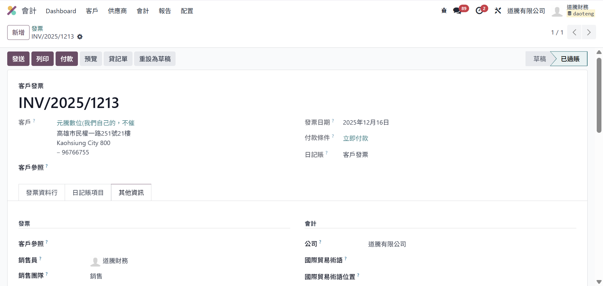 步驟一:打開該張「已過帳」的客戶發票