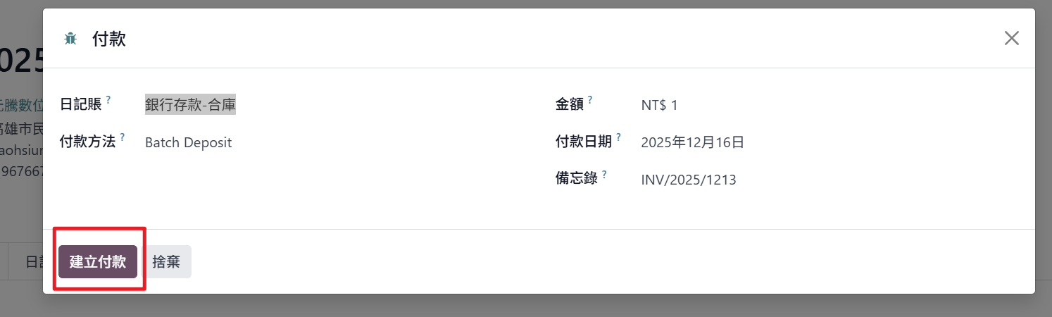 步驟四:點選【建立付款】,此單據狀態會更改為「已付款」。