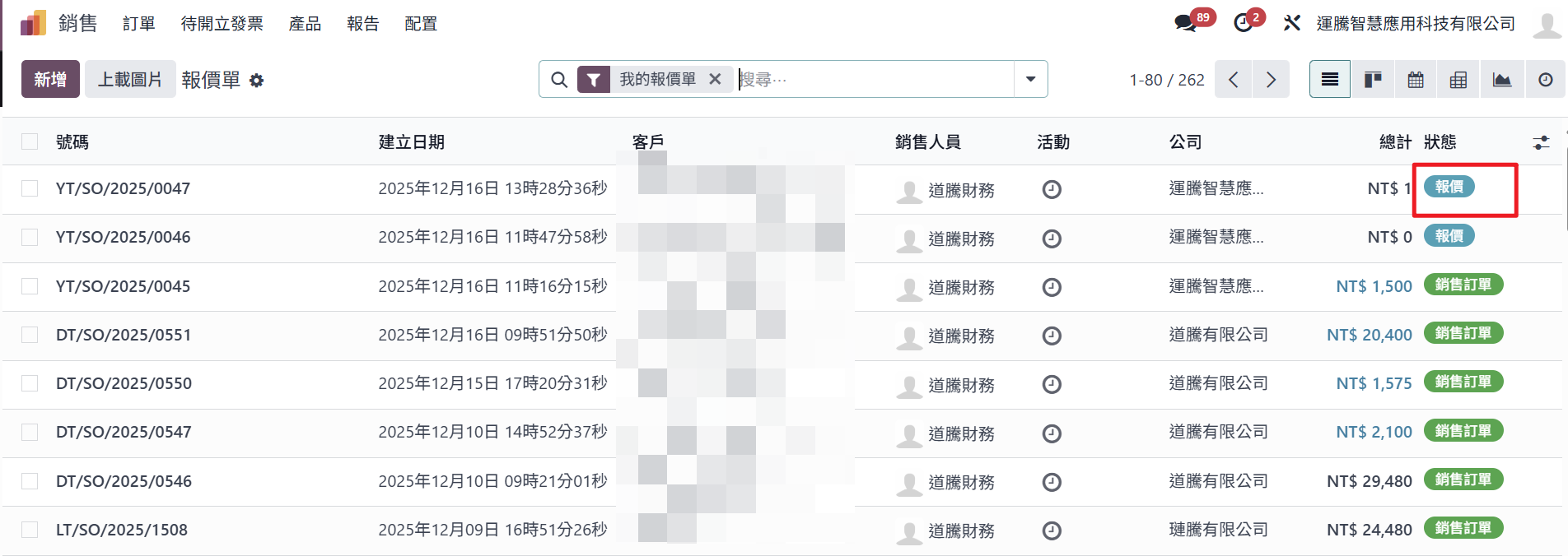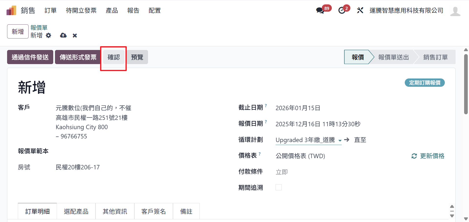 Answer:若未點選確認按鈕,在系統來說只是提案,可隨時修改報價內容,且狀態為「報價」。而點選「確認」後,則是代表已在系統上成立正式訂單,狀態為「銷售訂單」。