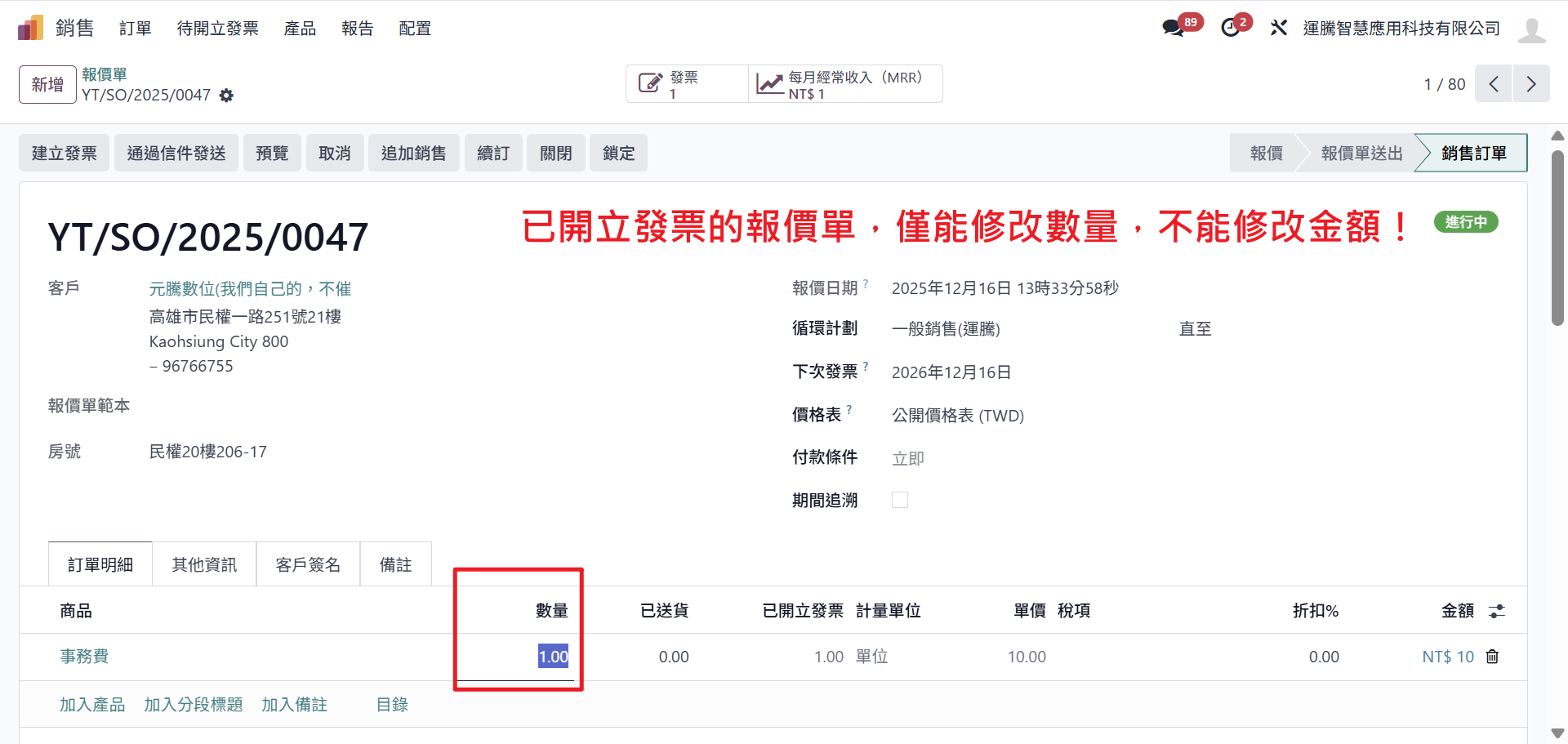 Answer:若此報價單已被 Confirm,且該單已進入後續流程(例如已開發票),則無法修改金額,僅能修改數量。