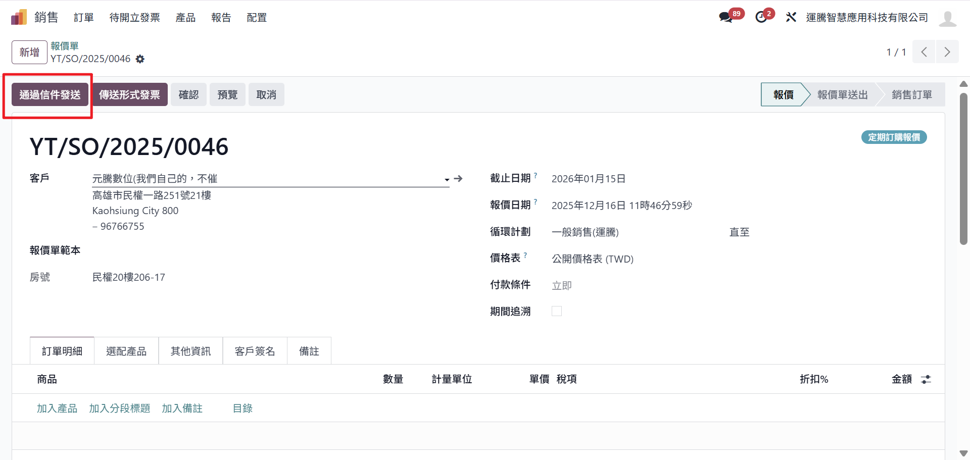 Answer:若報價單尚未轉成銷售訂單並開立發票,可直接修改報價單內容(產品、金額、備註),且修改後建議重新點選「發送」寄送最新版本。